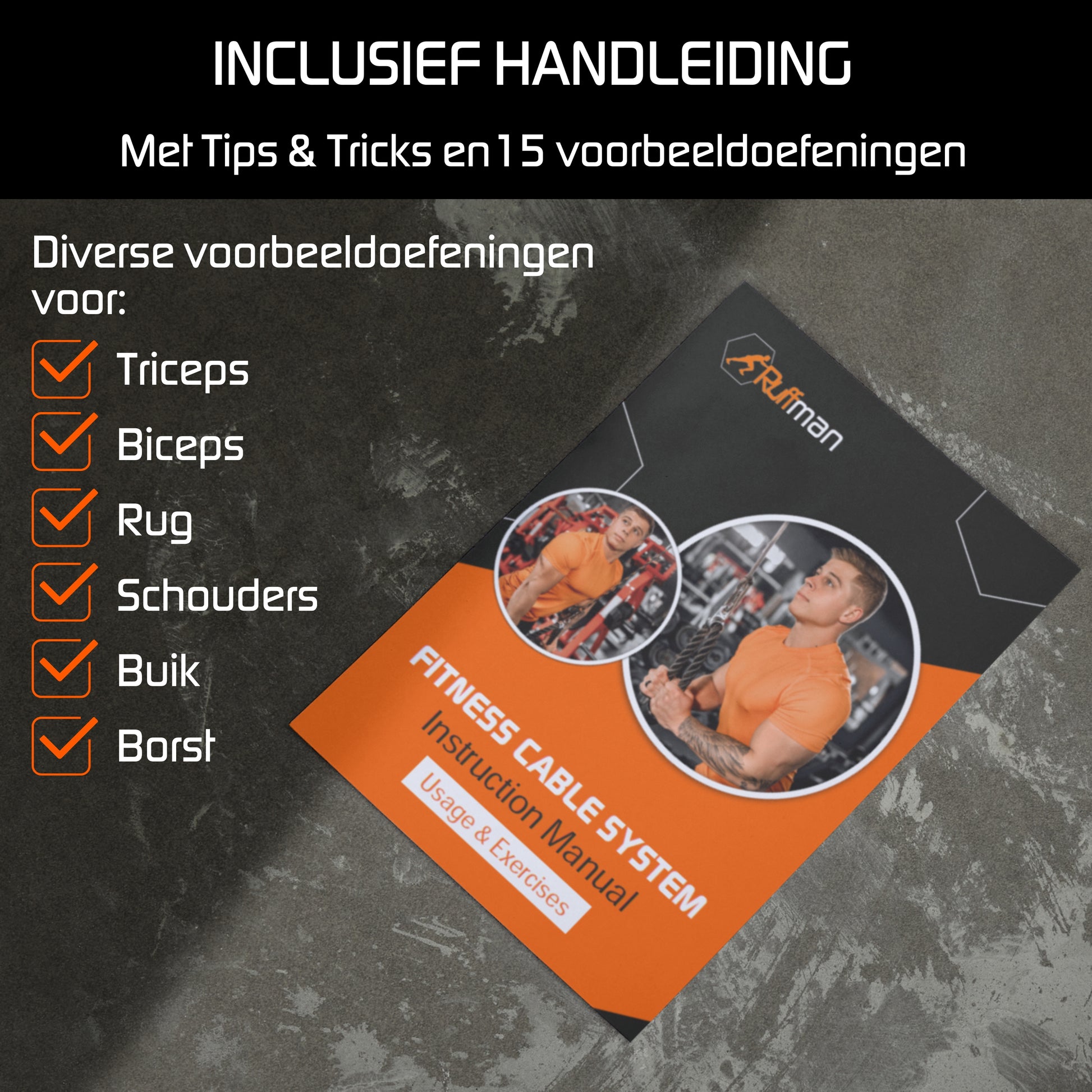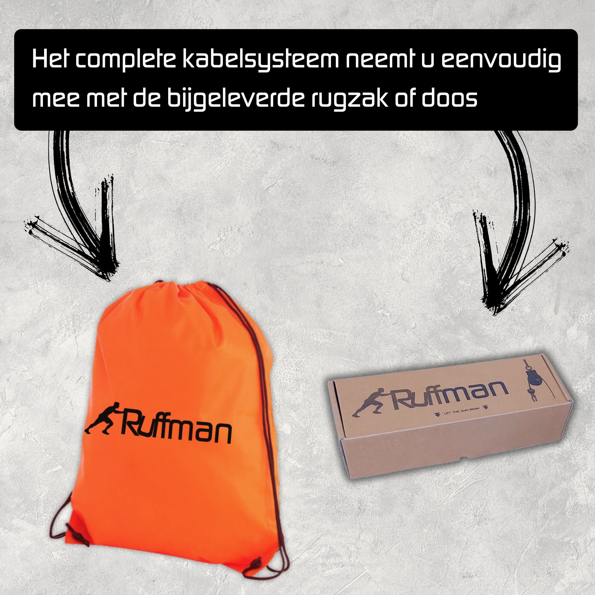 Om u op weg te helpen hebben de specialisten van Ruffman een handleiding opgesteld met uitgebreide uitleg over de installatie en gebruik van het kabelsysteem. Tevens worden er maar liefst 15 voorbeeldoefeningen weergegeven met ieder zijn niveau, van beginner tot advanced. De meeste oefeningen beginnen al bij een gewicht van 10kg.
