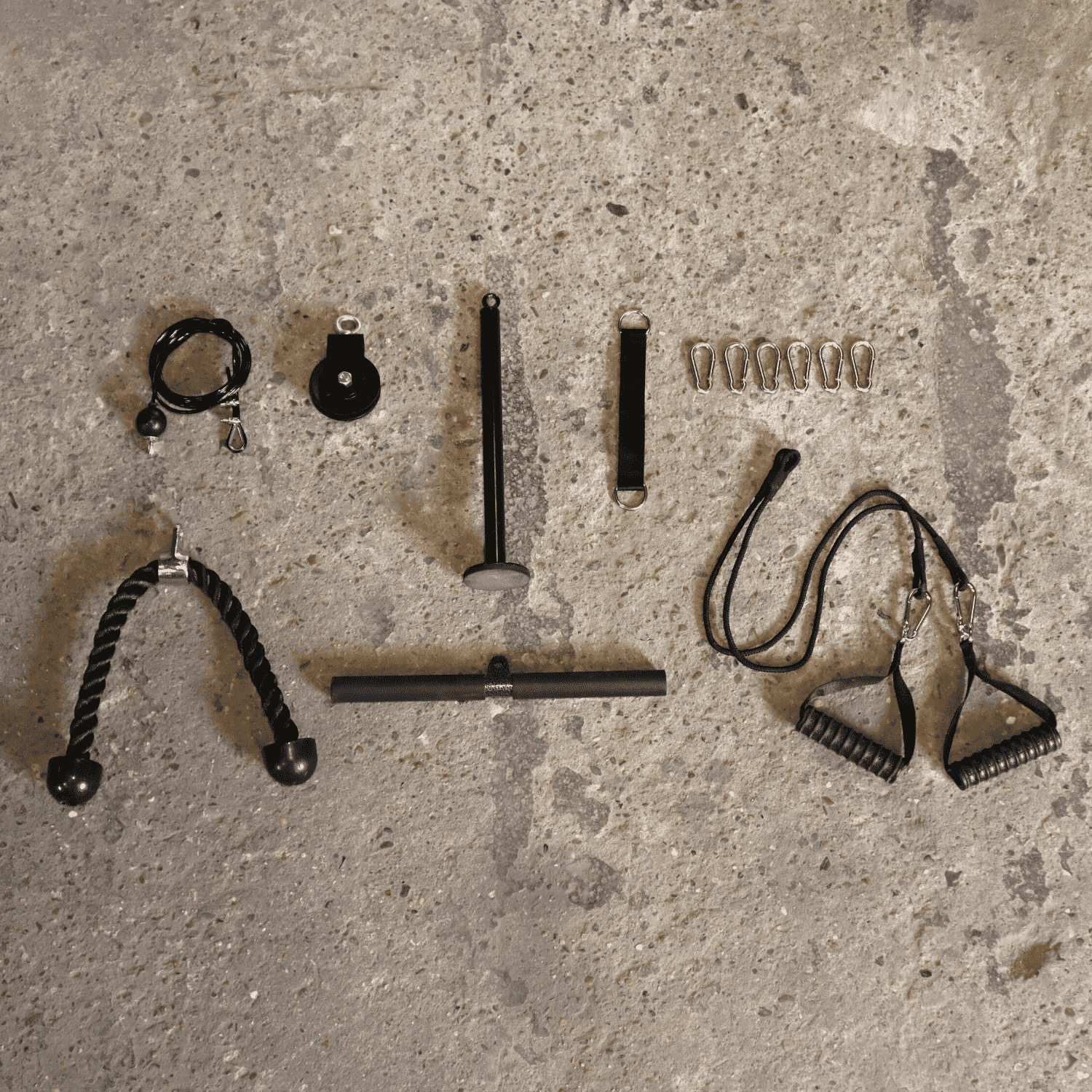 De 14-delige set bevat 3 verschillende handgrepen. Een triceps band, rechte stang en 2 handgrepen, waarvan je er ook één enkele kunt gebruiken. Hierdoor beschik je over de mogelijkheid om voor iedere spiergroep de juiste handgreep toe te passen tijdens jouw workout. De set is daarnaast eenvoudig op te bergen en mee te nemen met de bijgeleverde tas